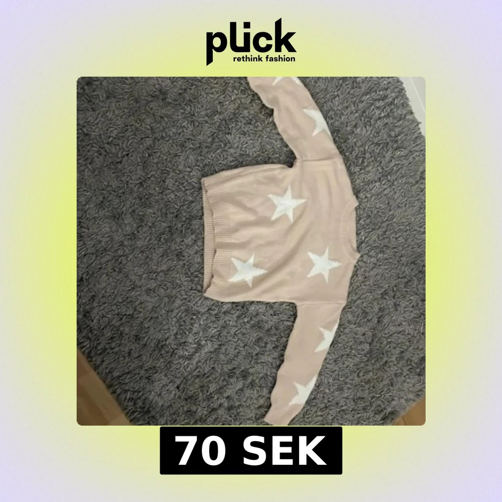 Säljer en mysig beige stickad tröja med vita stjärnor. Tröjan har långa ärmar och ribbade muddar vid ärmslut och nederkant. Perfekt för kyliga dagar!