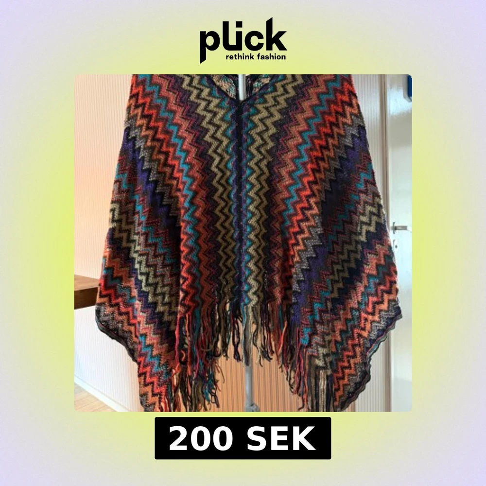 Poncho i stickat material med zigzag-mönster i lila, röd, beige, blå och orange. Snygga fransar längs nederkanten och loose passform. Perfekt för dig som gillar boho-vibe och vill ha något unikt och färgstarkt i garderoben.
