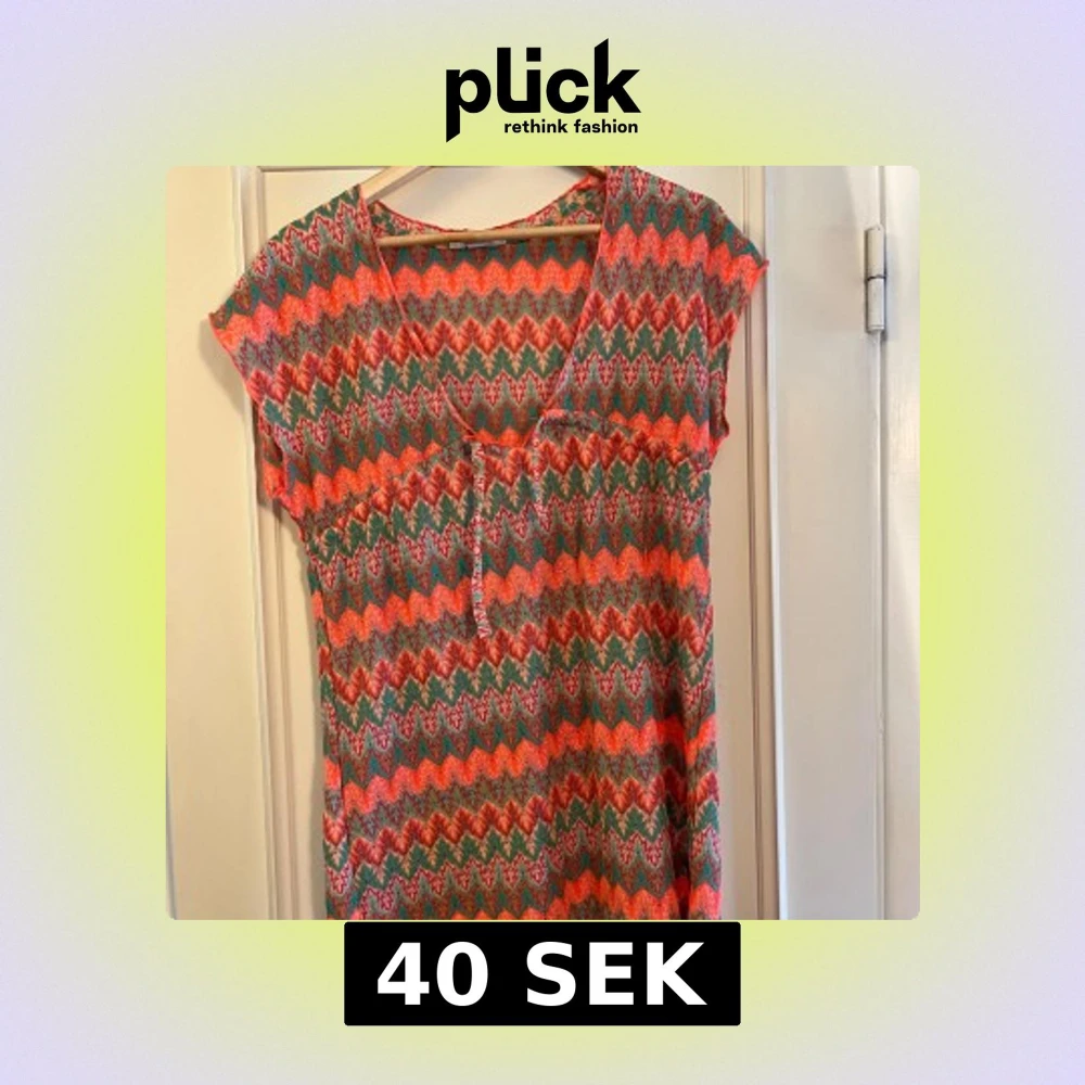 Superfin strand klänning från Primark med färgstarkt mönster i orange, grönt och rosa. Klänningen har v-ringning, korta ärmar och ett stickat, nästan virkat material. Perfekt för dig som gillar att sticka ut med färg och mönster! Skickar fler bilder vid intresse💞