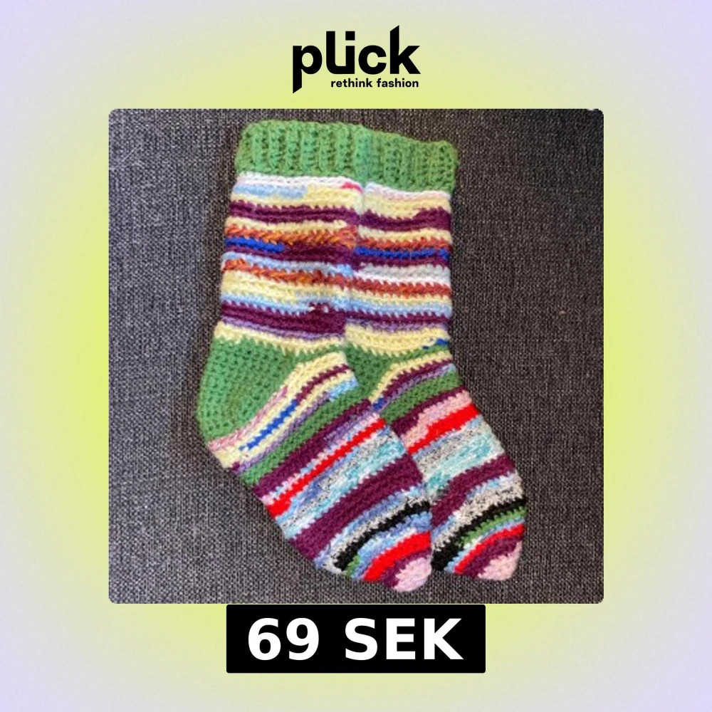 Ett par handvirkade, färgglada strumpor med gröna muddar. Strumporna har ett unikt mönster med ränder i olika färger. Virkade av restgarner! Skaft: 20 cm Fotlängd: 24 cm Inga bilder när den sitter på mig! Katter finns i hemmet!
