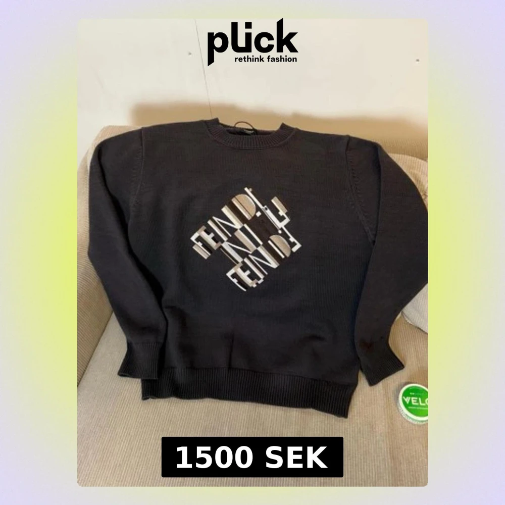 Svart stickad tröja från Fendi med rund hals och ribbade muddar. Framsidan har ett grafiskt Fendi-tryck i vitt och beige som ger en cool vibe. Perfekt för dig som gillar designer och vill sticka ut med en snygg logga på bröstet. Obs säljs endast på https://modeza.se