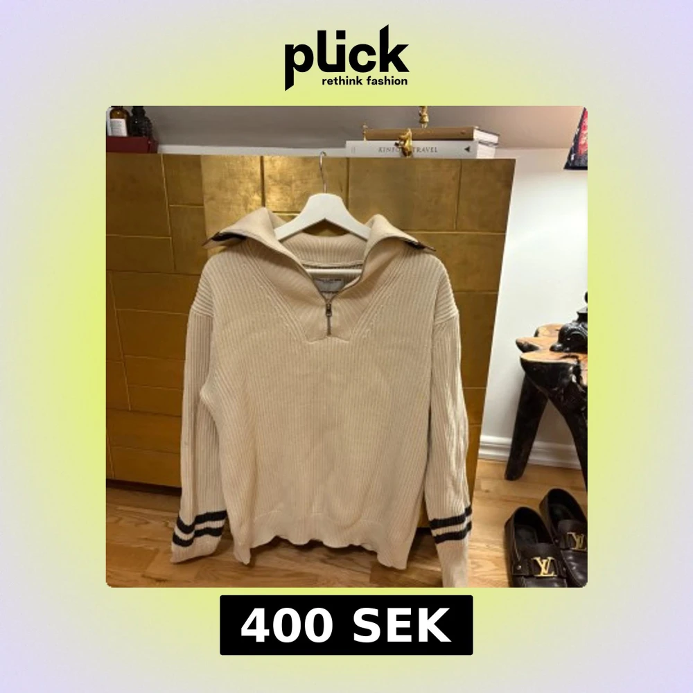 Säljer en beige stickad tröja från These Glory Days med halv dragkedja och bred krage. Tröjan har svarta ränder på ärmarna och kragen, samt ribbad struktur. Perfekt för dig som gillar en chill och stilren look.