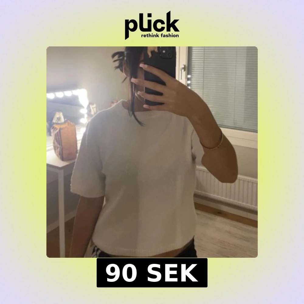 Säljer en vit croppad stickad topp med korta ärmar och rund hals. Den är från HM och nypris är 175kr