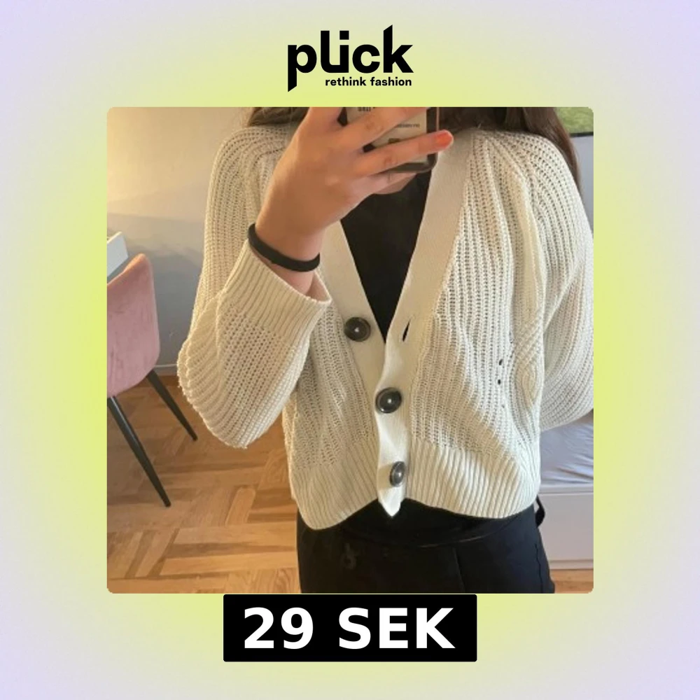 Säljer en jättefin vit stickad kofta i storlek 134/140! Det finns några små färgfläckar men som inte syns när man har koftan på 🫶