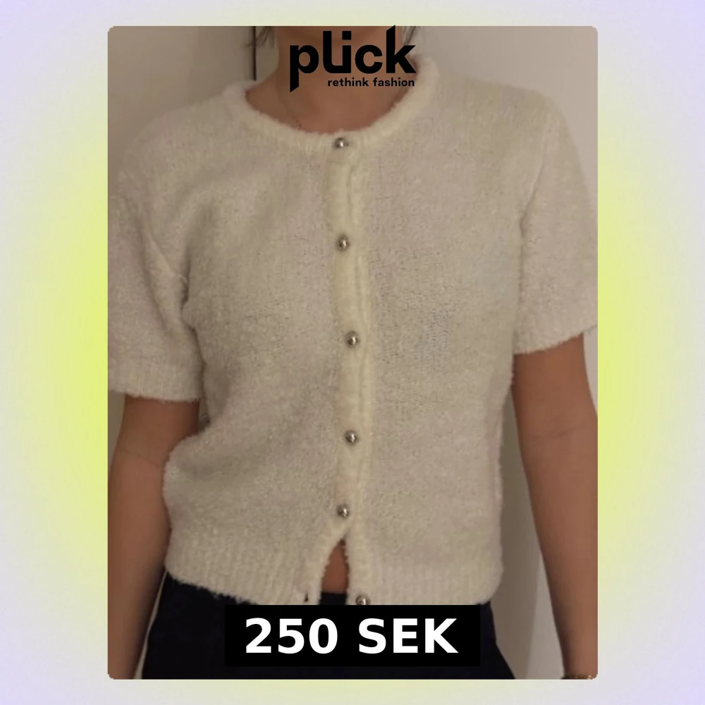 Mysig vit kofta med korta ärmar och rund hals. Tröjan är stickad och har silvriga knappar framtill som ger en clean och enkel look. Perfekt för dig som gillar en soft och chill stil. Passar till både jeans och kjol.