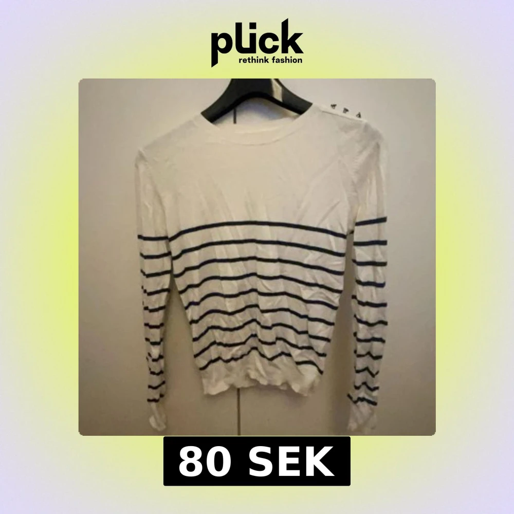 Finstickad tröja med mörkblå ränder och knappar på ena axeln. Lite skrynklig, har inte försökt stryka själv. Annars bra skick