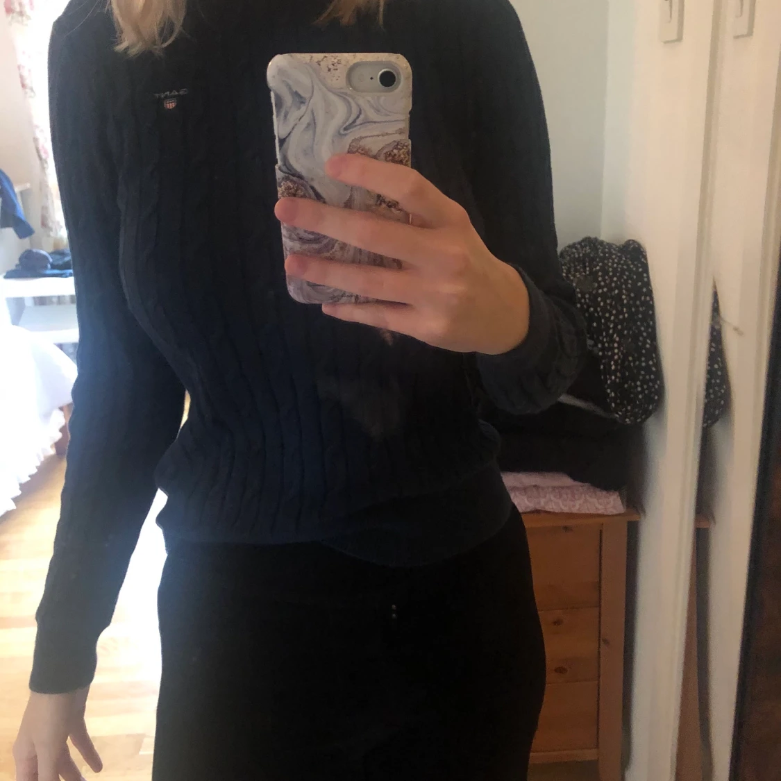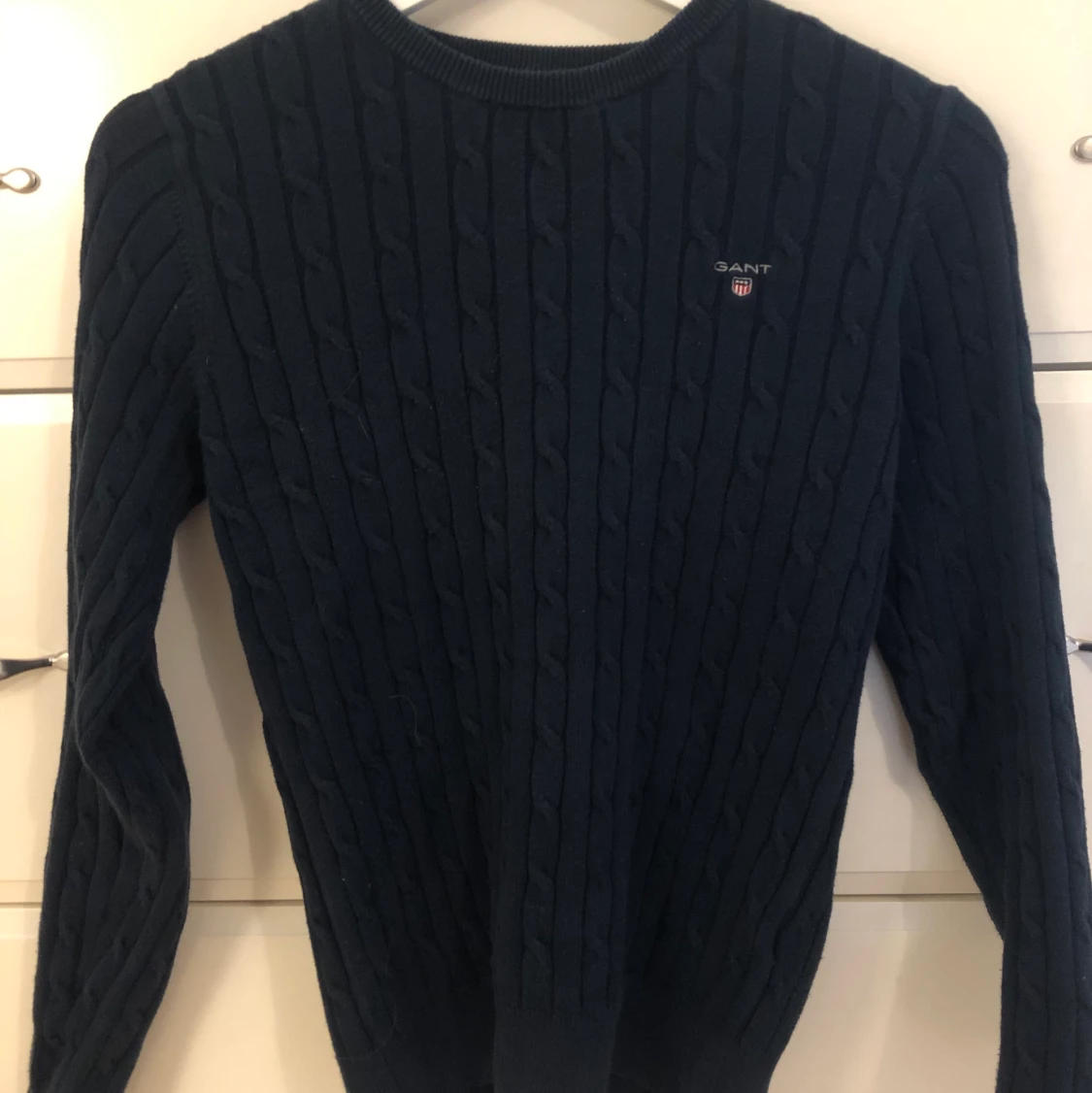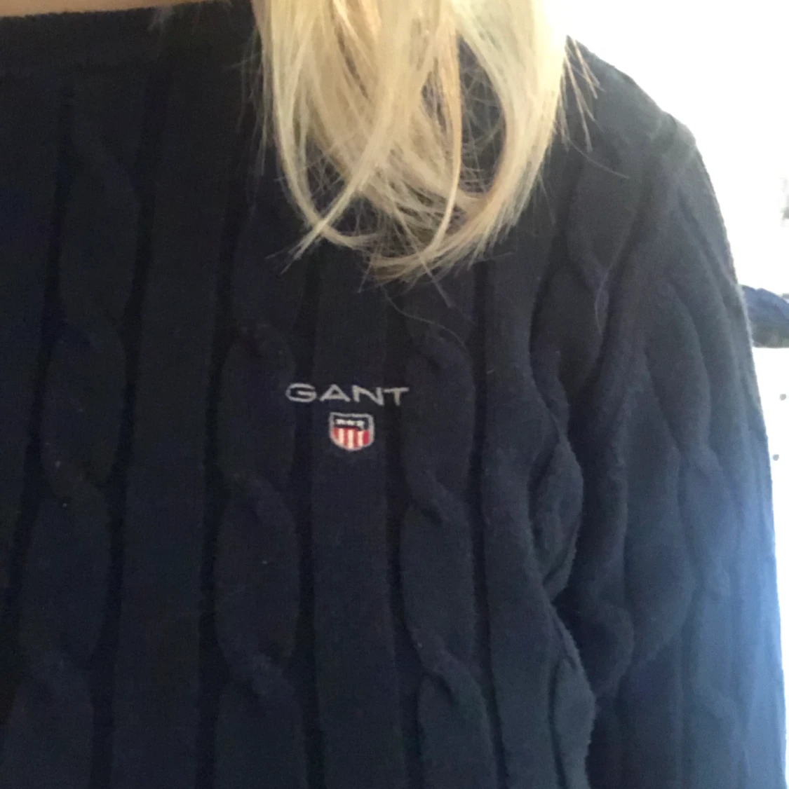 Stickad tröja från Gant. Kvaliten är som ny, bara använd fåtal gånger. Storleken är S. Färgen är marinblå