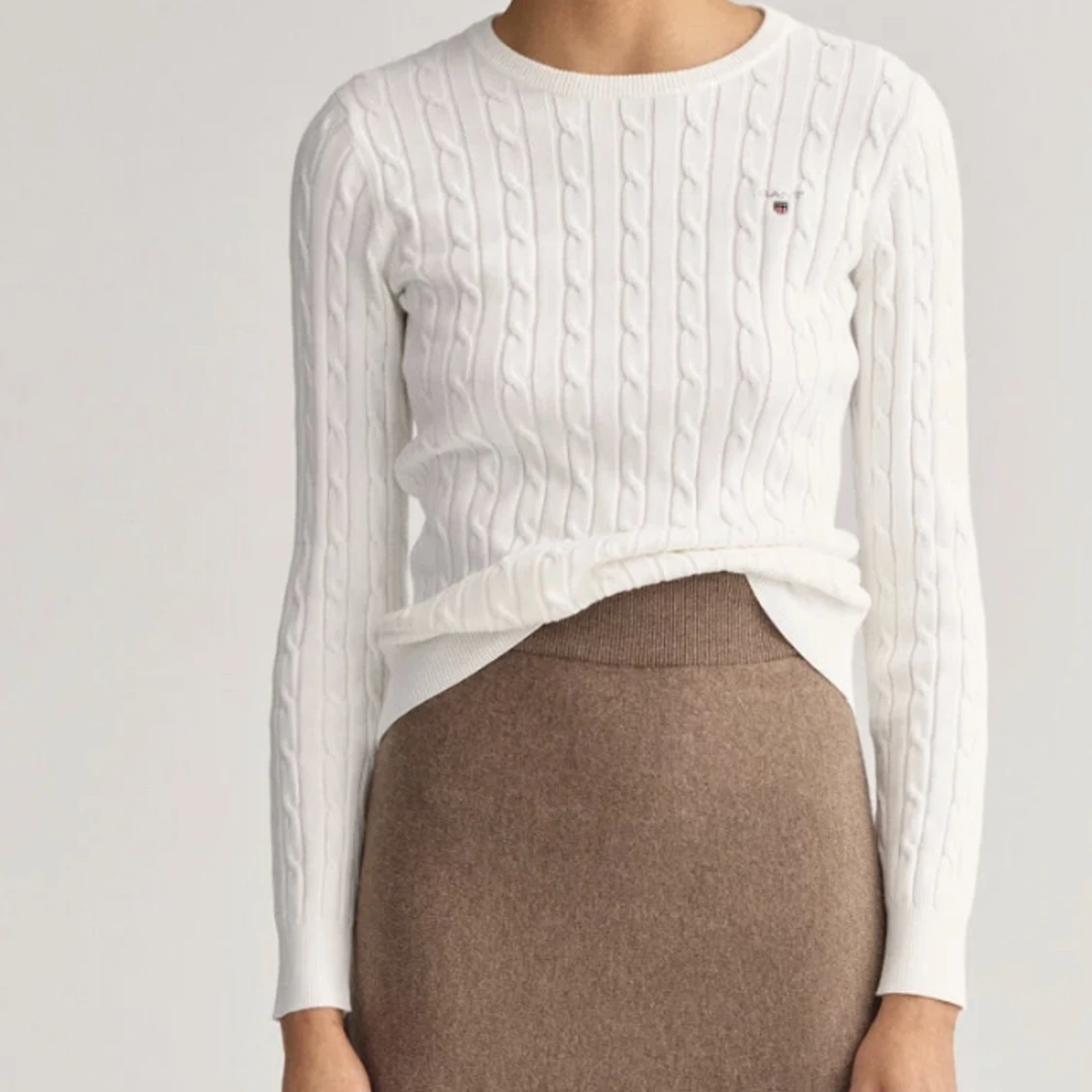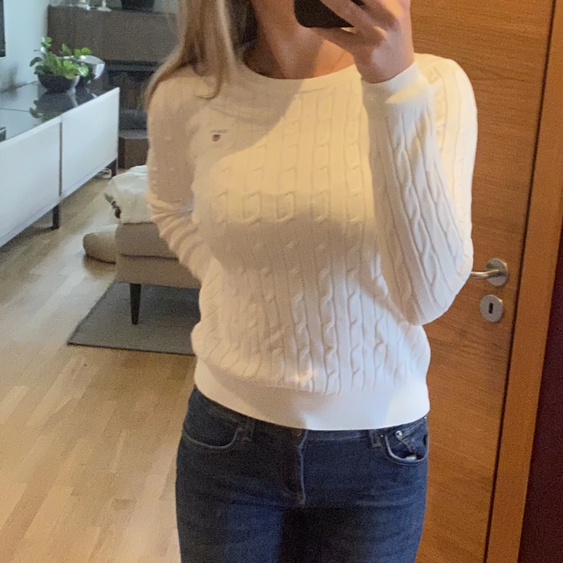 Vit kabelstickad tröja från gant💕helt oanvänd och nypris är 900kr. Är i storlek 164 men passar som S