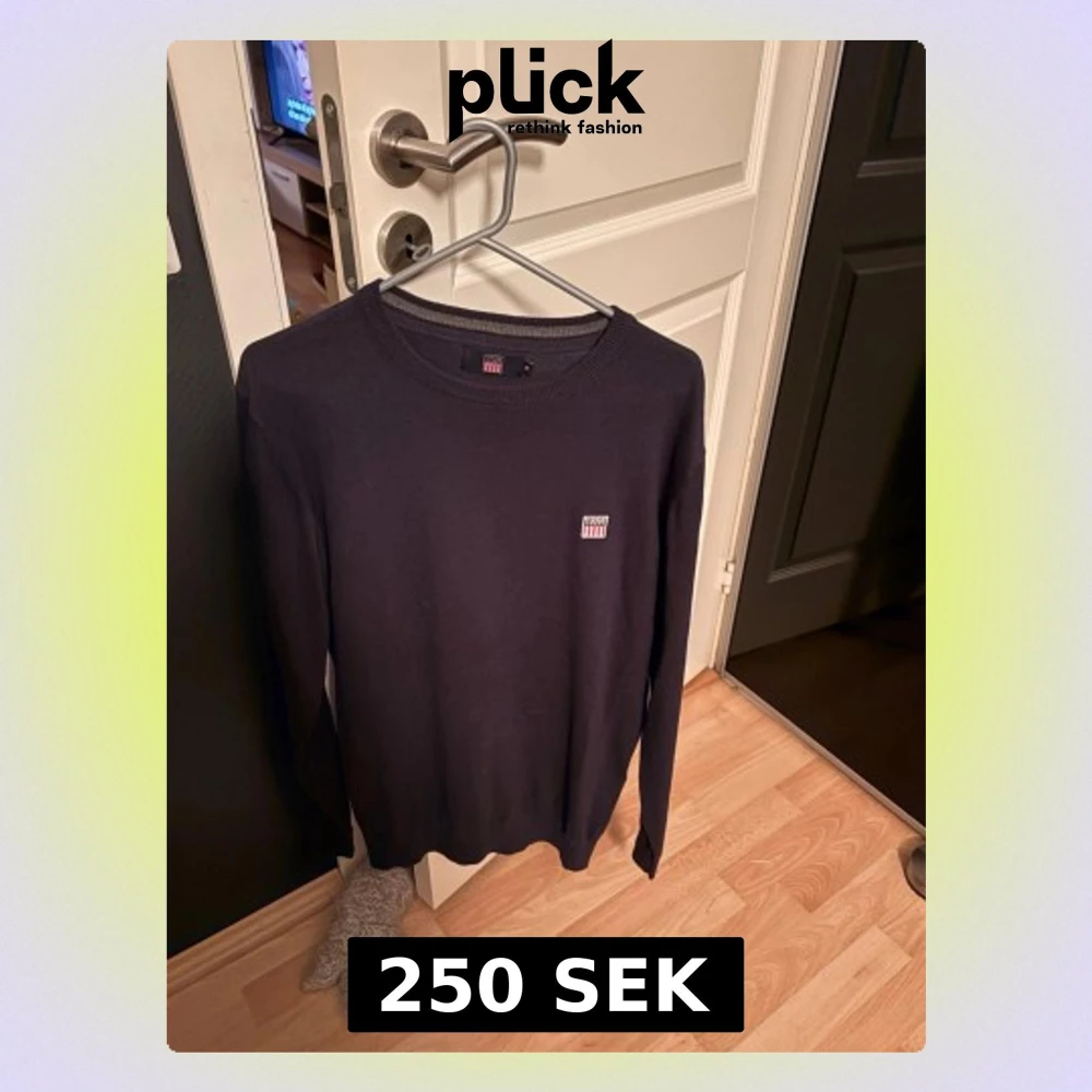 Snygg mörkblå stickad tröja från Gant med rund hals och liten logotyp på bröstet. Tröjan har långa ärmar och en klassisk, stilren design som passar perfekt till jeans eller chinos. Perfekt för dig som gillar enkel och tidlös stil.