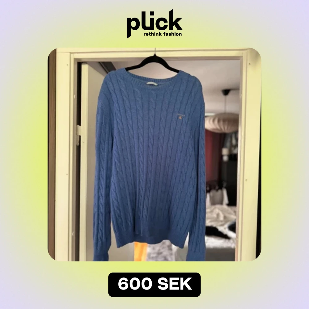 Säljer en snygg blå stickad tröja från GANT. Den har ett klassiskt flätmönster och en liten broderad logga på bröstet. Perfekt för kyliga dagar och passar både till vardags och lite finare tillfällen. Tröjan är i storlek M och är i mycket bra skick.