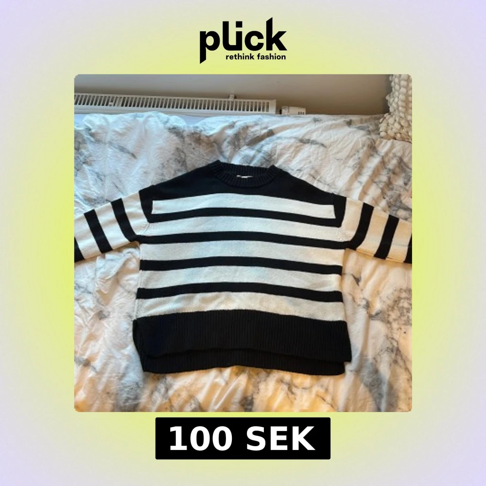 Snygg stickad tröja från Gina Tricot i svart och vitt med breda horisontella ränder. Tröjan har rund hals, långa ärmar och ribbade muddar vid ärmslut och nederkant. Tröjan har en del tecken på användning som t.ex lite nopprig och har en liten fläck som ni kan se på sista bilden men den syns knappt och går säkert att få bort. Tröjan är i storlek 134/140 men passar även mig som är ca 160 lång nästan perfekt.
