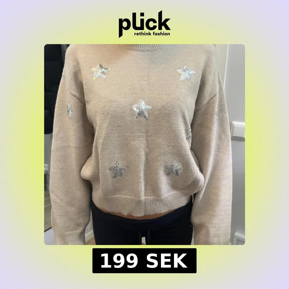 Säljer en beige stickad tröja från Gina Tricot med glittriga stjärnor. Tröjan har en bekväm passform och långa ärmar. Perfekt för att lysa upp vardagen med lite glitter!