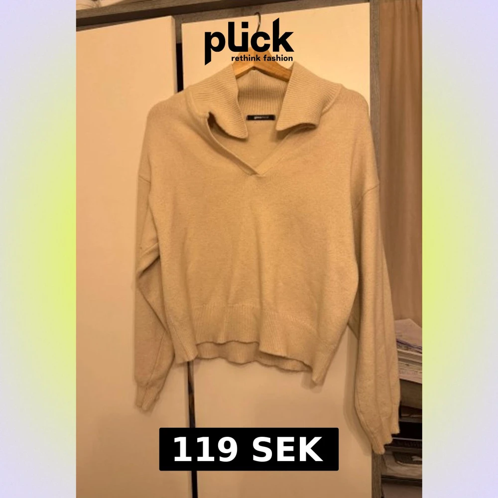Snygg beige stickad tröja från Gina Tricot med bred krage och v-ringning. Tröjan har långärmade ärmar och ribbade detaljer vid kragen och muddar. Perfekt för dig som gillar en chill och stilren look. Men funkar även som S och M