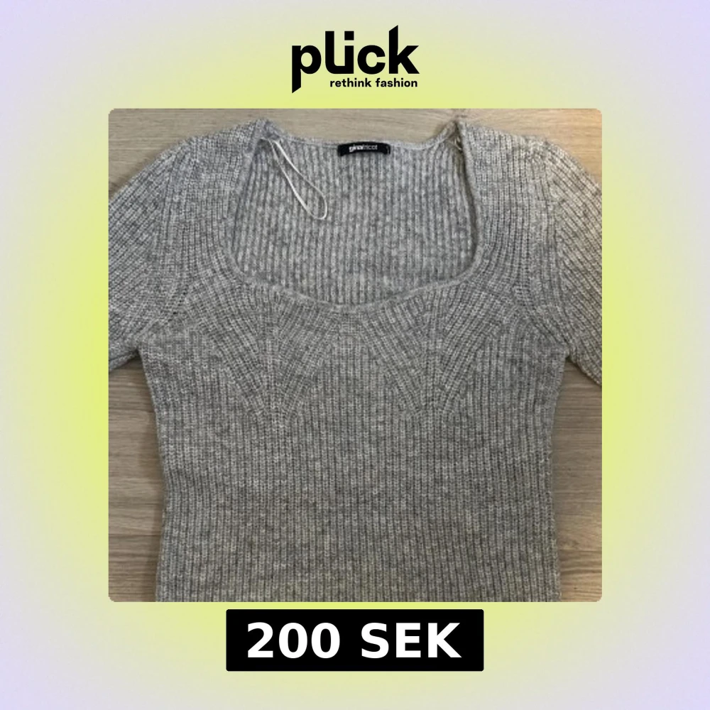 Grå ribbstickad tröja från Gina Tricot med fyrkantig ringning och lång ärm. Tröjan har en slim passform. Använd 2 gånger.