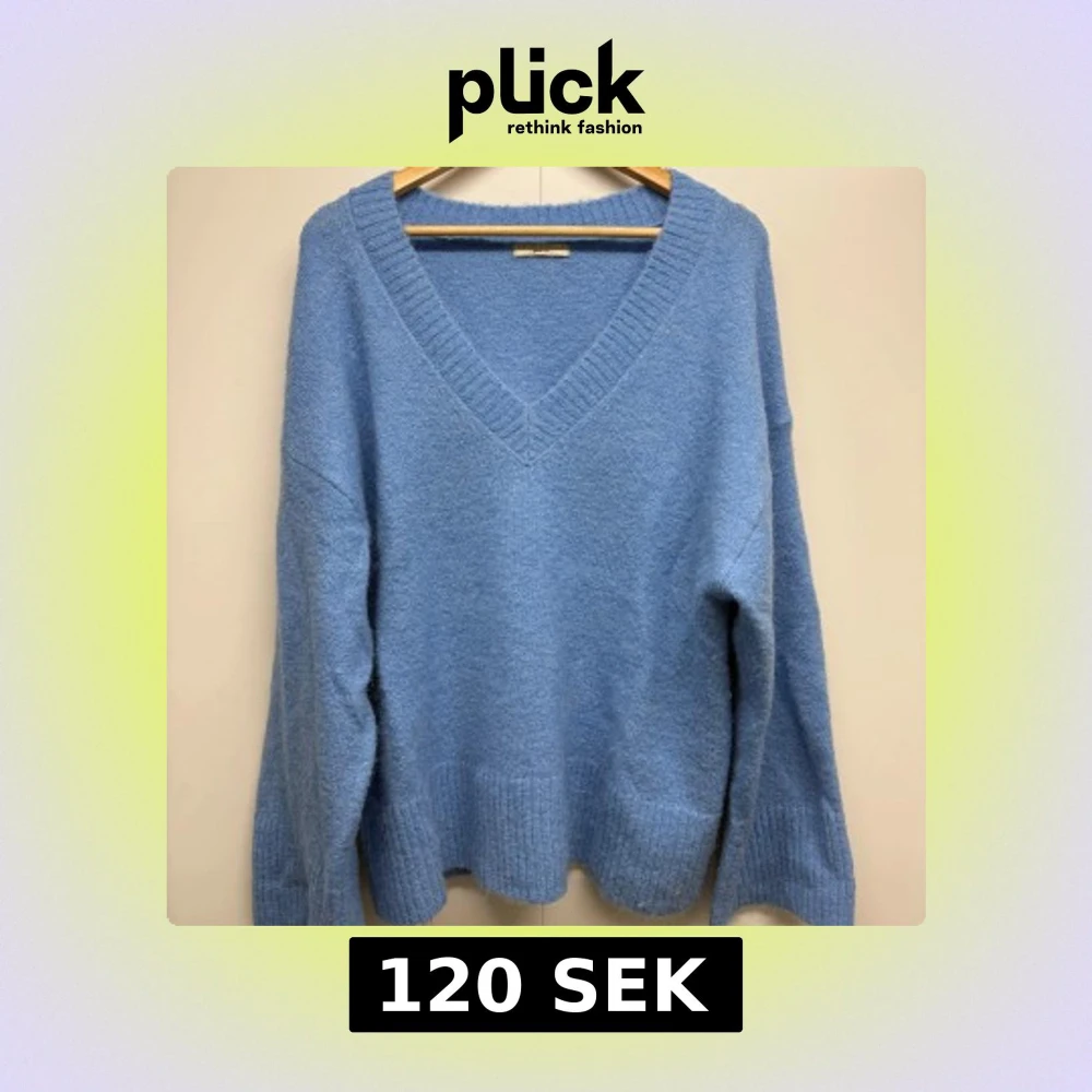 Mysig ljusblå stickad tröja från Gina Tricot med bred v-ringning och ribbade muddar vid ärmslut och nederkant. Tröjan har en loose passform och långa ärmar, perfekt för att hålla sig varm under kyliga dagar.
