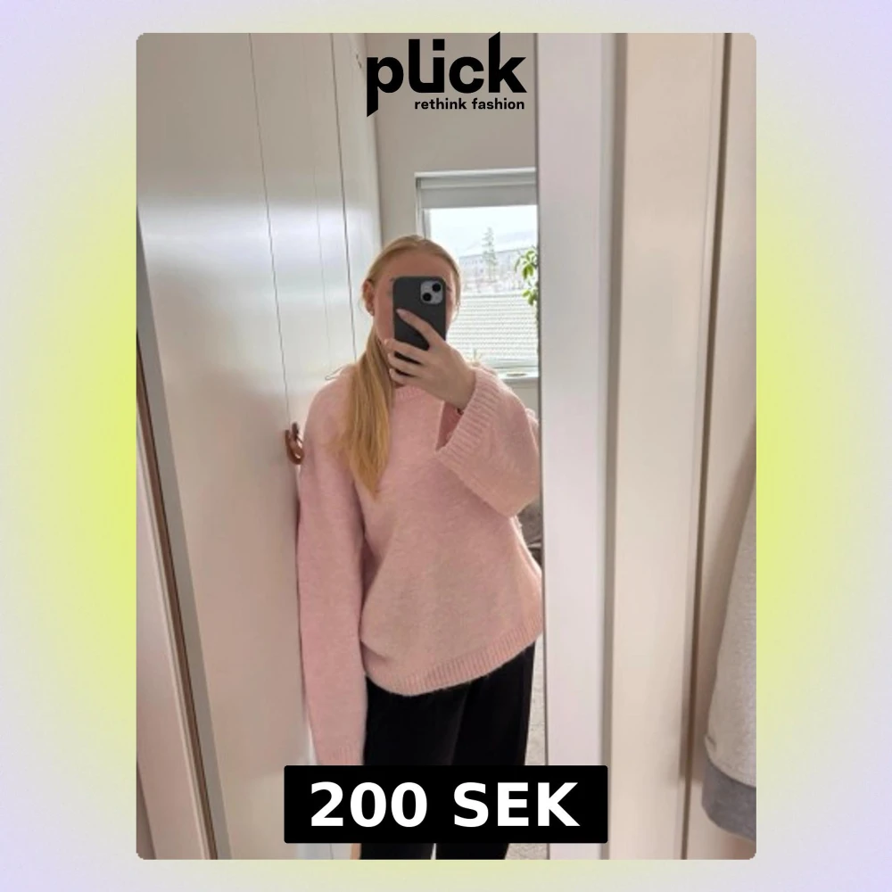 Mysig ljusrosa stickad tröja med oversized passform och ribbade muddar vid hals, ärmslut och nederkant. Tröjan har en enkel design och är perfekt för lager-på-lager-stil. Materialet ser ut att vara mjukt och fluffigt, troligen en ull- eller akrylblandning. Nypris 399kr