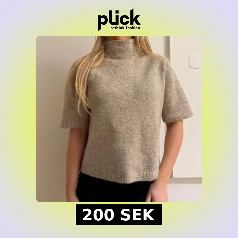 Supermysig beige stickad polotröja med korta ärmar och hög krage. Tröjan har en rak passform och ribbade kanter vid ärmslut, hals och nederkant. Perfekt för lager-på-lager under höst och vår.