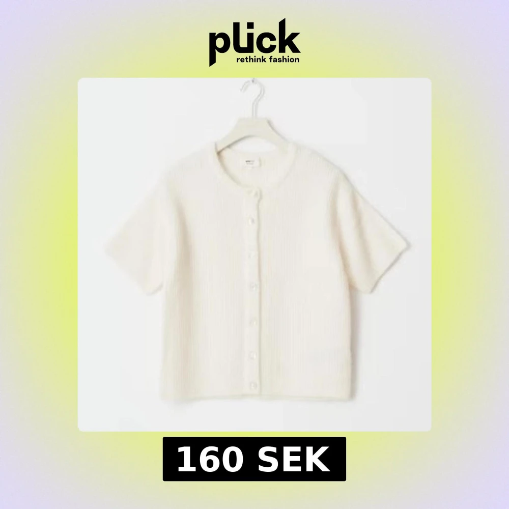 Superfin kortärmad kofta i beige stickat material med rund hals och knäppning framtill. Perfekt att slänga över ett linne eller t-shirt för en chill och stilren look. Koftan har en mjuk känsla och passar till både jeans och kjol. Xs/s