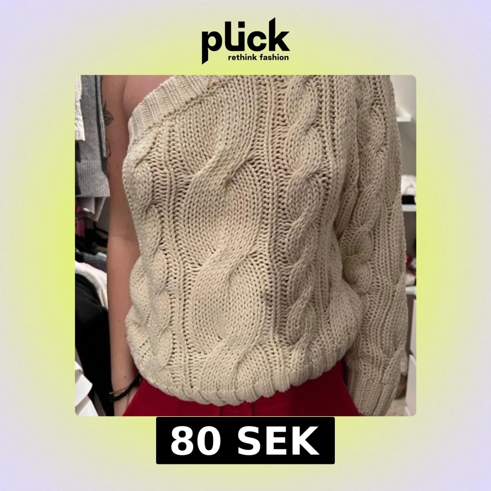 Snygg beige stickad tröja med offshoulder-design och flätstickat mönster. Perfekt för kyliga dagar när du vill vara både varm och trendig.