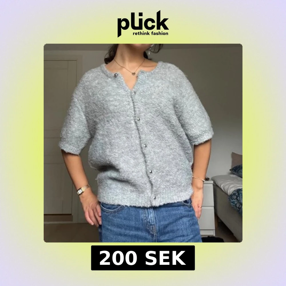 Supermjuk kortärmad ljusgrå stickad kofta med snygga pärlknappar framtill. Koftan har en avslappnad passform och ribbade kanter vid ärmslut och nederkant.