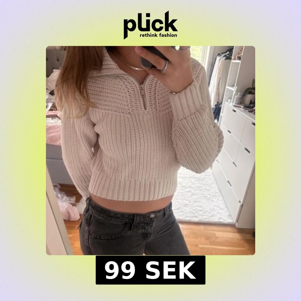 Säljer en beige croppad stickad tröja med half zip från Gina Tricot. Tröjan har ett chunky ribbat mönster och långa ärmar. Perfekt för dig som gillar en chill och snygg look med lite edge. Passar till både jeans och kjol.