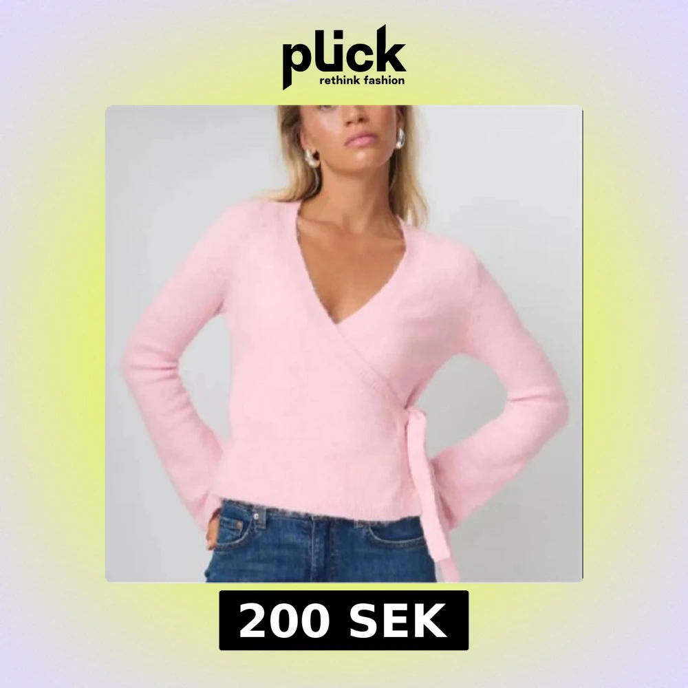 Superfin ljusrosa omlottkofta från Gina Tricot med knyt i sidan och v-ringad hals. Koftan är stickad och har långa ärmar, perfekt att slänga över en topp eller linne. Snygg och enkel att styla till jeans eller kjol.