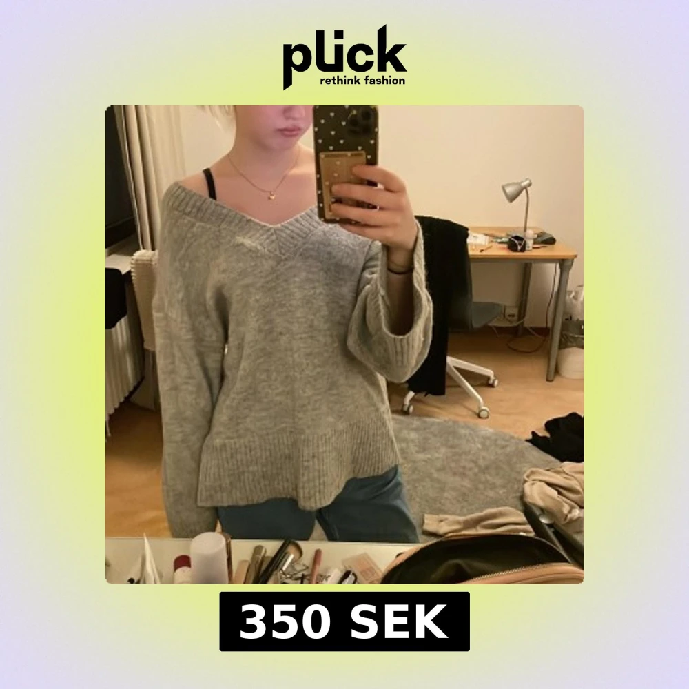Mysig grå stickad tröja från Gina tricot med v-ringning och breda ribbade muddar vid ärmslut och nederkant. Oversized passform och långärmad, perfekt för lager på lager under kyliga dagar.