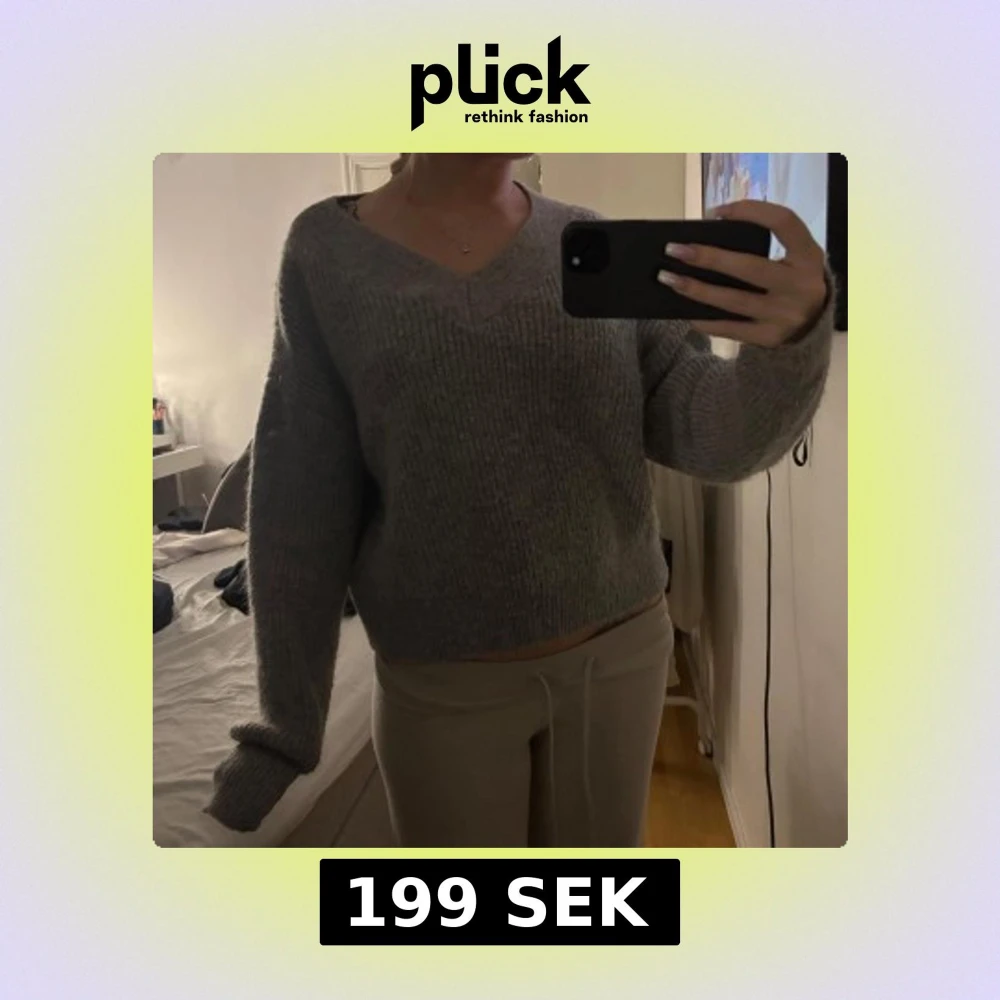 Mysig grå stickad tröja med v-ringad hals och långärmad modell. Enkel att matcha med både jeans och mjukisbyxor.