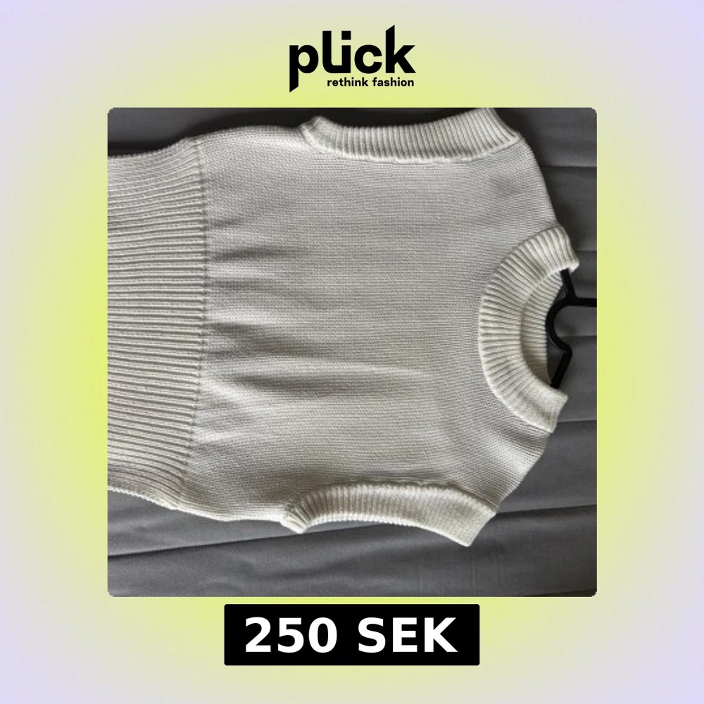 Snygg vit stickad väst med ribbade kanter vid hals, ärmöppningar och midja. Den är perfekt att styla över en skjorta eller t-shirt