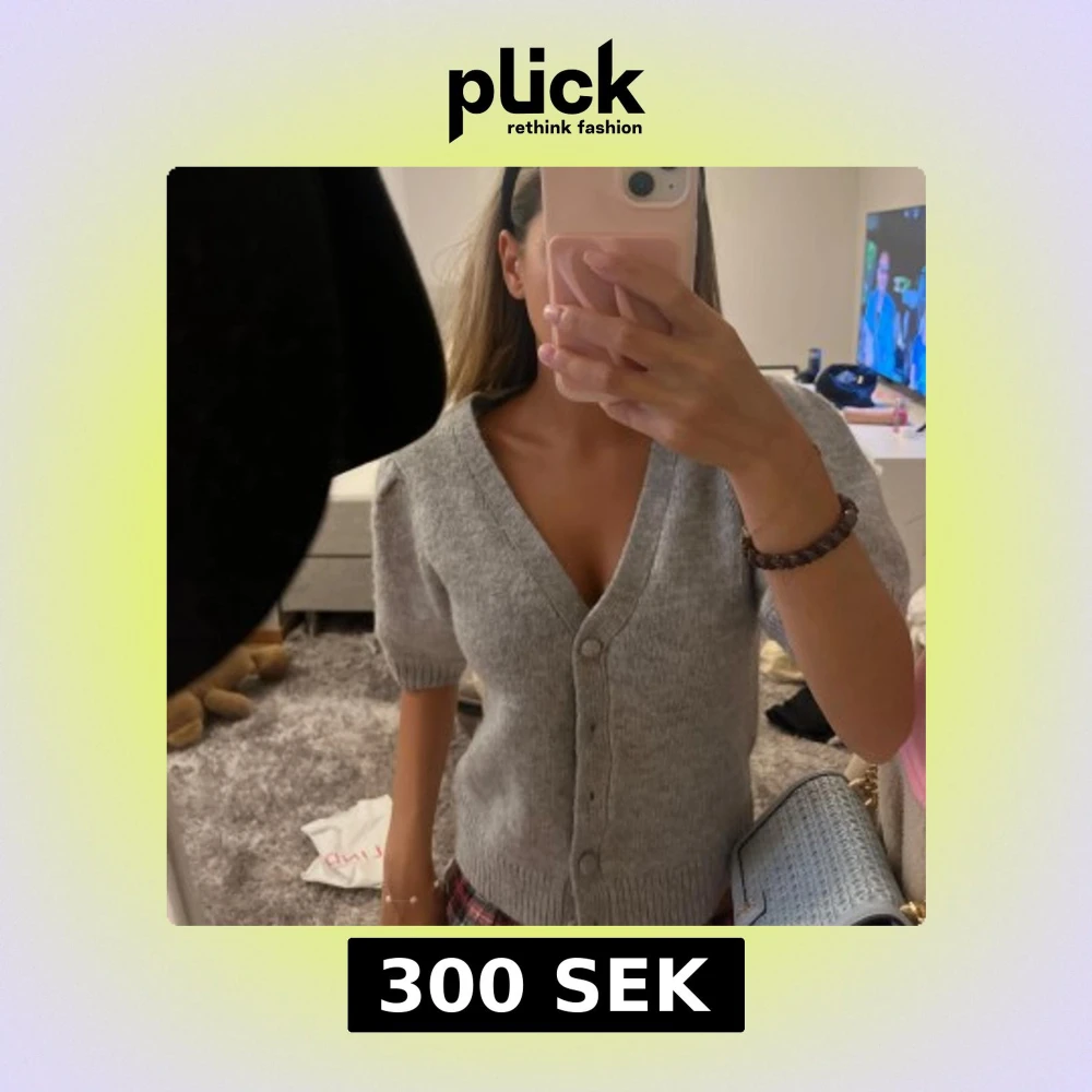 Superfin grå stickad kofta med korta puffärmar och v-ringning. Koftan har knappar framtill och ribbade muddar vid ärmslut och nederkant. Perfekt att slänga över en topp för en chill look.