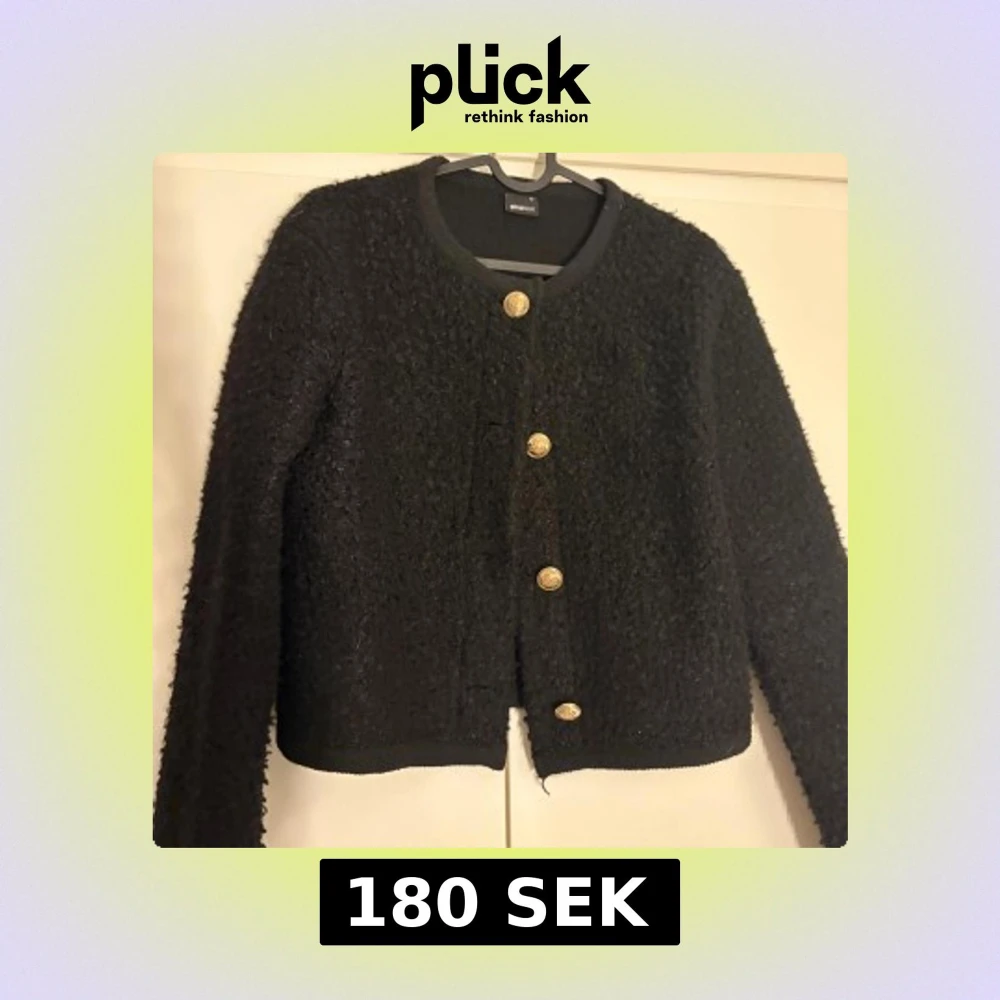 Svart cardigan jacka från Gina Tricot i storlek XS. Jackan har en fluffig, stickad yta och är dekorerad med fyra snygga guldfärgade knappar framtill. Rund halsringning och långärmad modell, perfekt för lager-på-lager-stil. Old money style