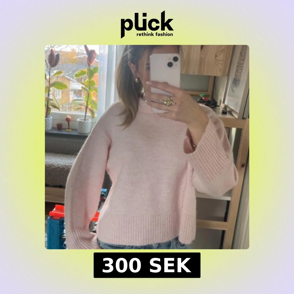 Supermysig ljusrosa stickad tröja med breda, ribbade muddar vid ärmslut och nederkant. Tröjan har en rak passform och hög halsringning, perfekt att matcha med jeans för en chill look.