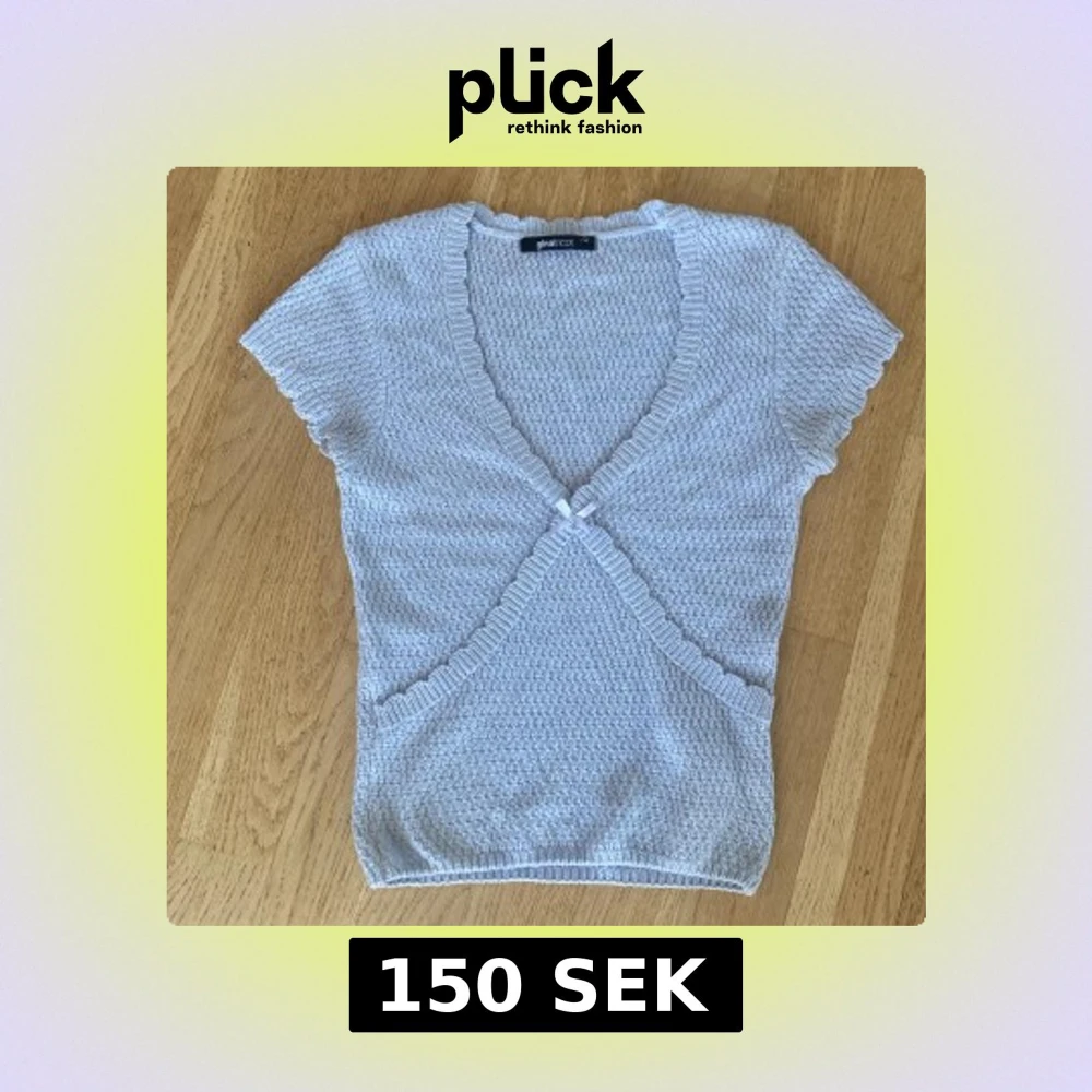 Supersöt ljusblå stickad topp från Gina Tricot med korta ärmar, v-ringning och en liten rosett framtill. Toppen har ribbade kanter och ett fint virkat mönster som ger en mjuk och feminin vibe. Perfekt att styla med jeans eller kjol för en trendig look.