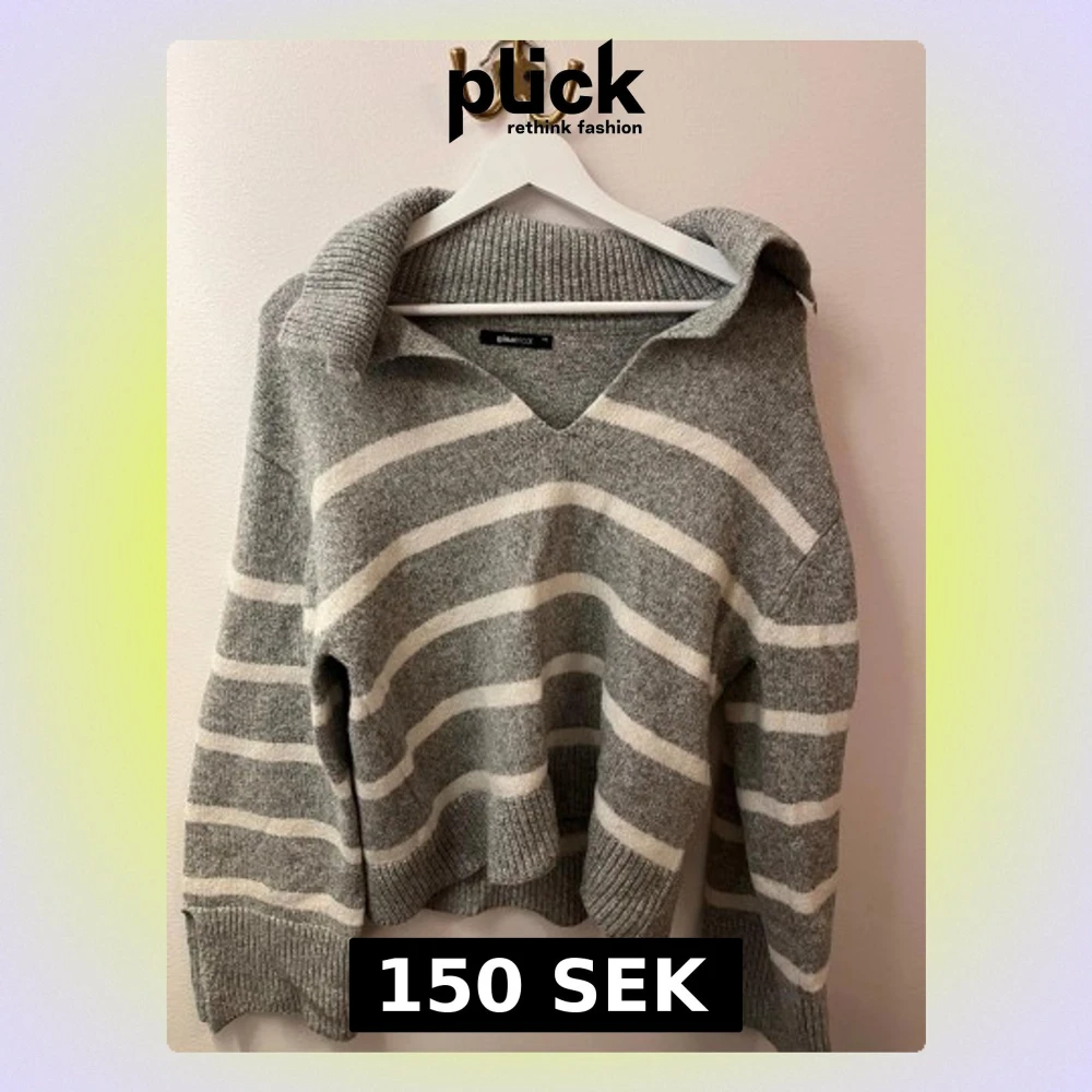 Mysig stickad tröja från Gina Tricot i grått med vita ränder. Tröjan har en bred krage, v-ringad hals och långa ärmar med ribbade muddar. Perfekt för att hålla sig varm och snygg under kyliga dagar.