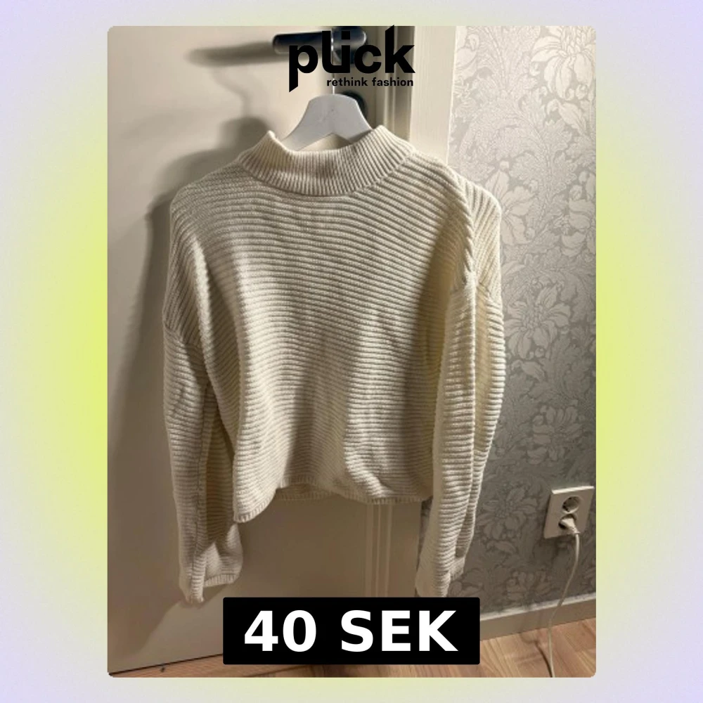 Säljer en vit stickad tröja från Gina Tricot i storlek XS. Tröjan har en ribbad struktur, hög krage och långa ärmar. Perfekt för att hålla sig varm under kyliga dagar och passar till både jeans och kjol.