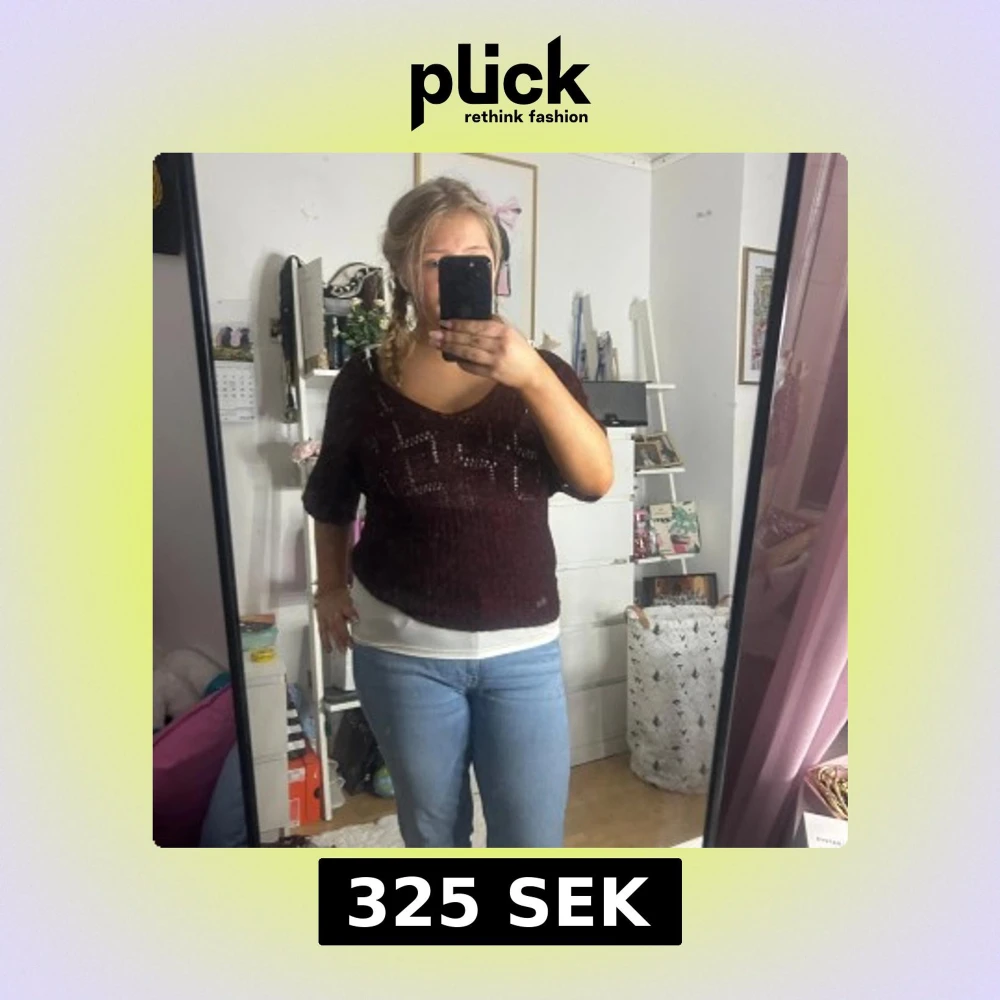 Säljer en vinröd stickad tröja med korta ärmar och ett luftigt stickmönster. Står ingen storlek på lappen men skulle gissa M-L. Pris kan absolut diskuteras!💗