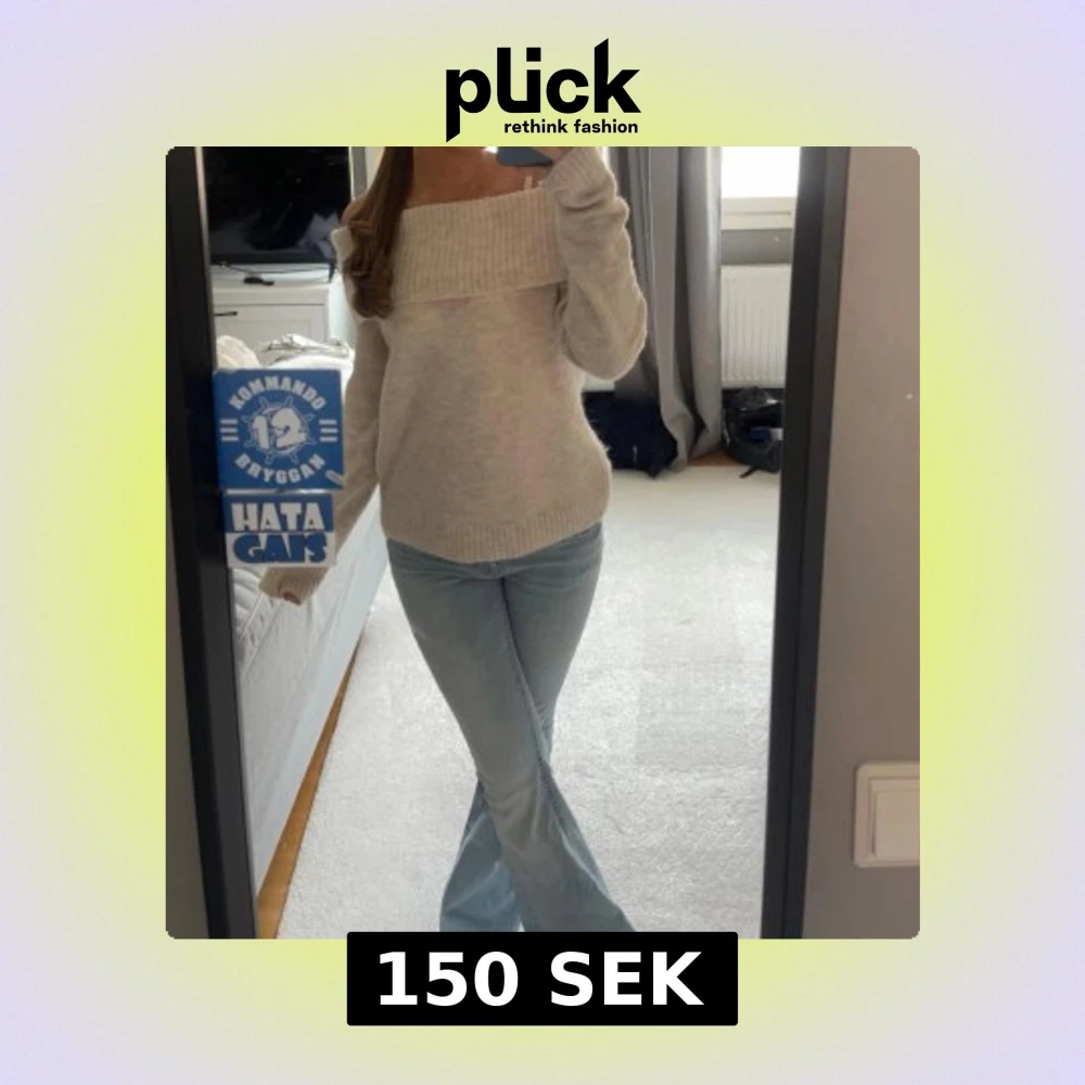 Supermysig beige stickad tröja från Ginatricot med bred ribbad krage som går offshoulder. Säljer då den inte kommer till användning🤍