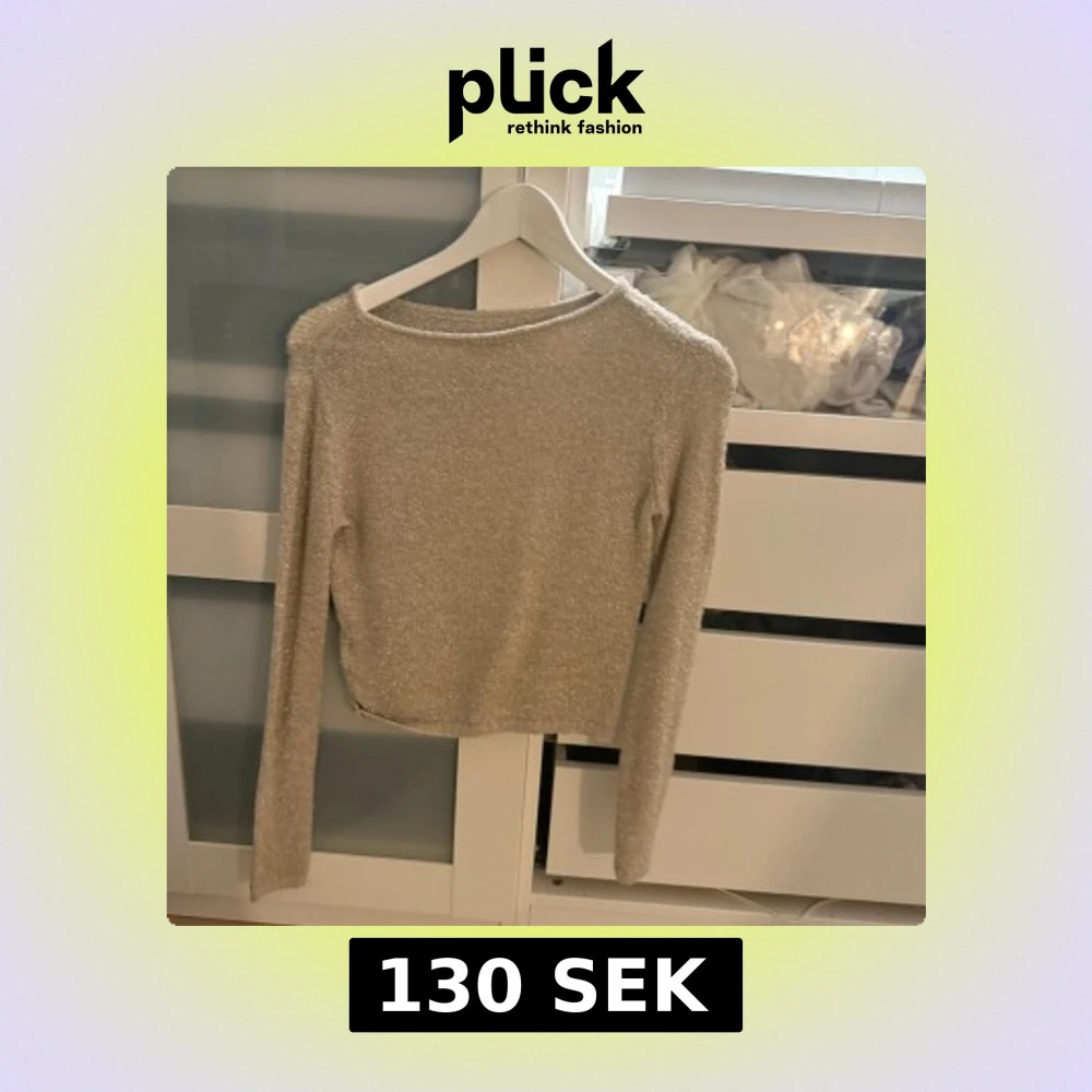 Säljer en glittrig beige stickad topp med lång ärm och rund hals. Toppen har en lätt croppad passform och är perfekt för dig som vill sticka ut lite extra. Materialet är mjukt och skimrar snyggt i ljuset.