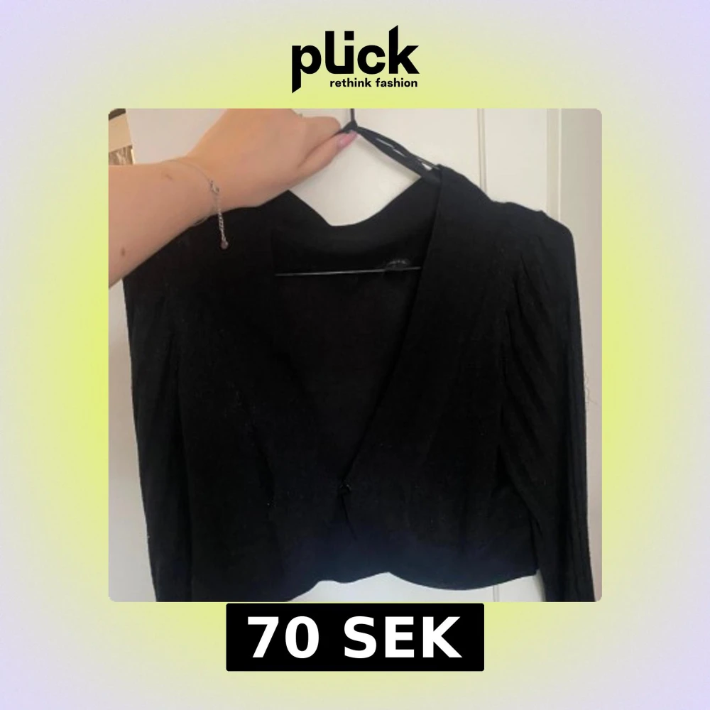 Snygg svart kofta från Lindex med glittriga inslag. Modellen är croppad med trekvartsärm och har en enkel knäppning framtill. Perfekt för att lyfta en outfit med lite extra shine. Materialet är stickat och känns mjukt mot huden.