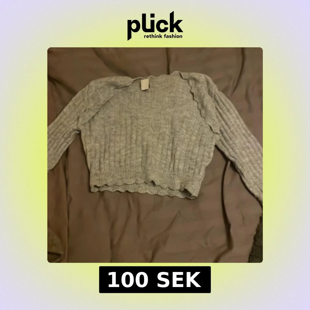 Supermysig grå croppad stickad tröja med långärmad design och ribbade detaljer. Tröjan har vågiga kanter vid halsringning, ärmslut och nederkant som ger en extra touch. Perfekt för dig som gillar en chill och trendig look.