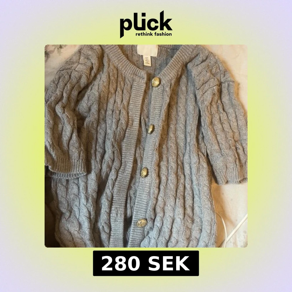 Säljer en grå kabelstickad kofta med snygga guldknappar framtill. Koftan har kort ärm och bred ribbad kant vid hals och ärmslut. Perfekt för lager-på-lager och chill dagar.