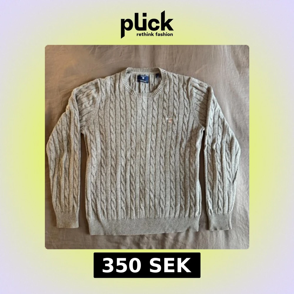 Säljer en grå kabelstickad tröja från GANT i premium bomull. Tröjan har rund halsringning, ribbade muddar och GANT-logga broderad på bröstet. Perfekt för dig som gillar klassisk och stilren look med en modern touch.