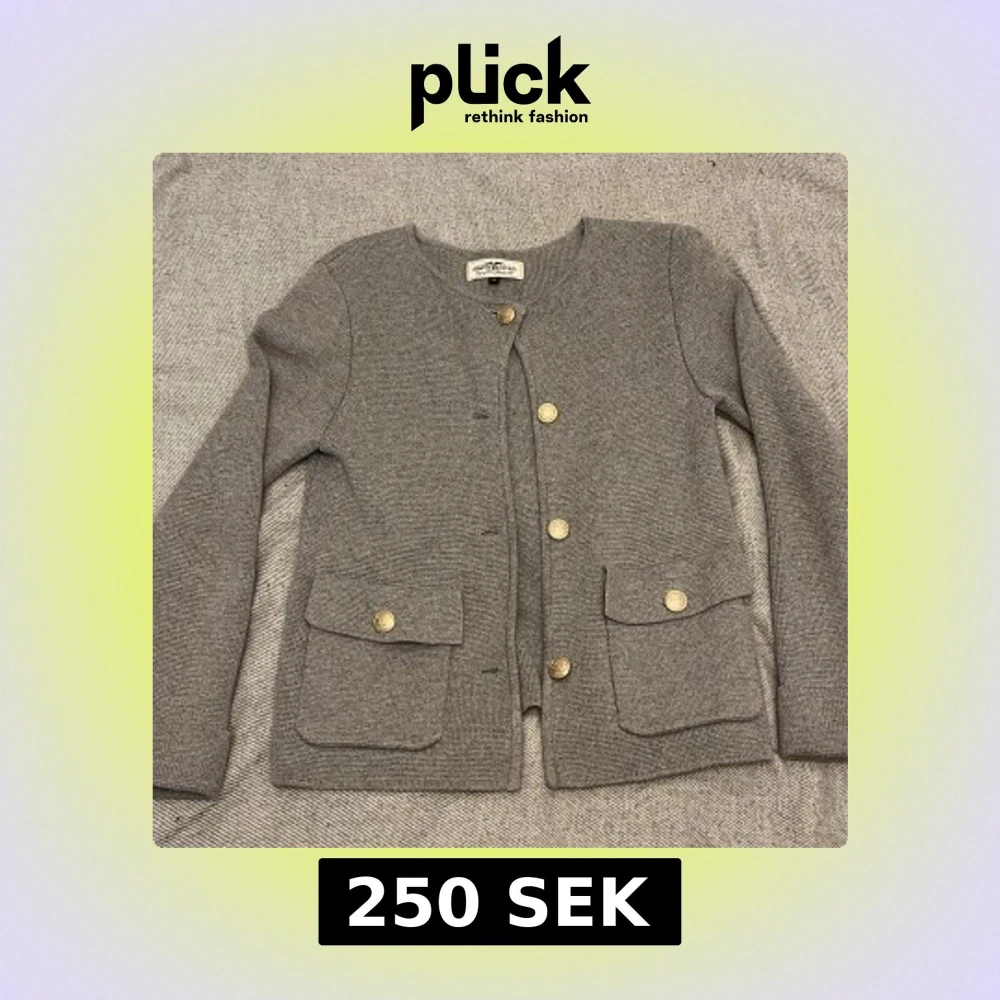 Grå kofta från Hampton Republic med snygga guldknappar och två stora fickor framtill. Jackan är stickad i mjukt material och har rund halsringning samt lång ärm. Köpt för 700kr