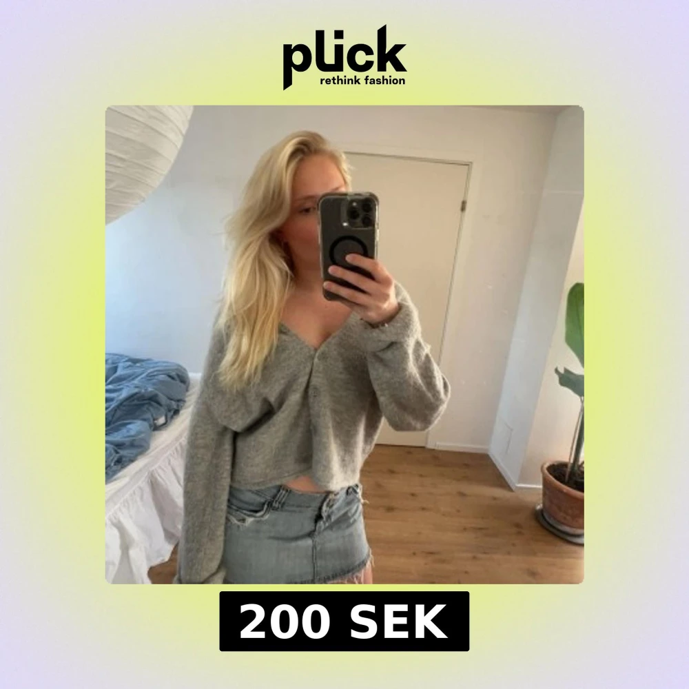 Säljer en grå kofta med v-ringning och långa ärmar. Tröjan är stickad och har en avslappnad passform, perfekt att styla med jeans eller kjol. Supermjuk och skön att ha på sig!