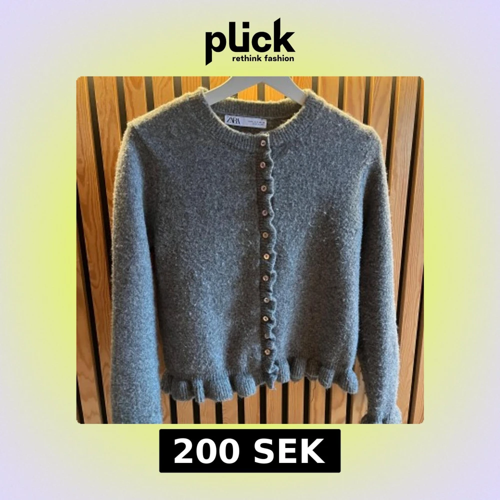 Mysig grå kofta från Zara med volangdetaljer längs nederkanten och knäppning framtill med pärlemorknappar. Koftan är stickad och har lång ärm, perfekt för lager-på-lager och chill vibes. Tveka inte på att höra av dig!