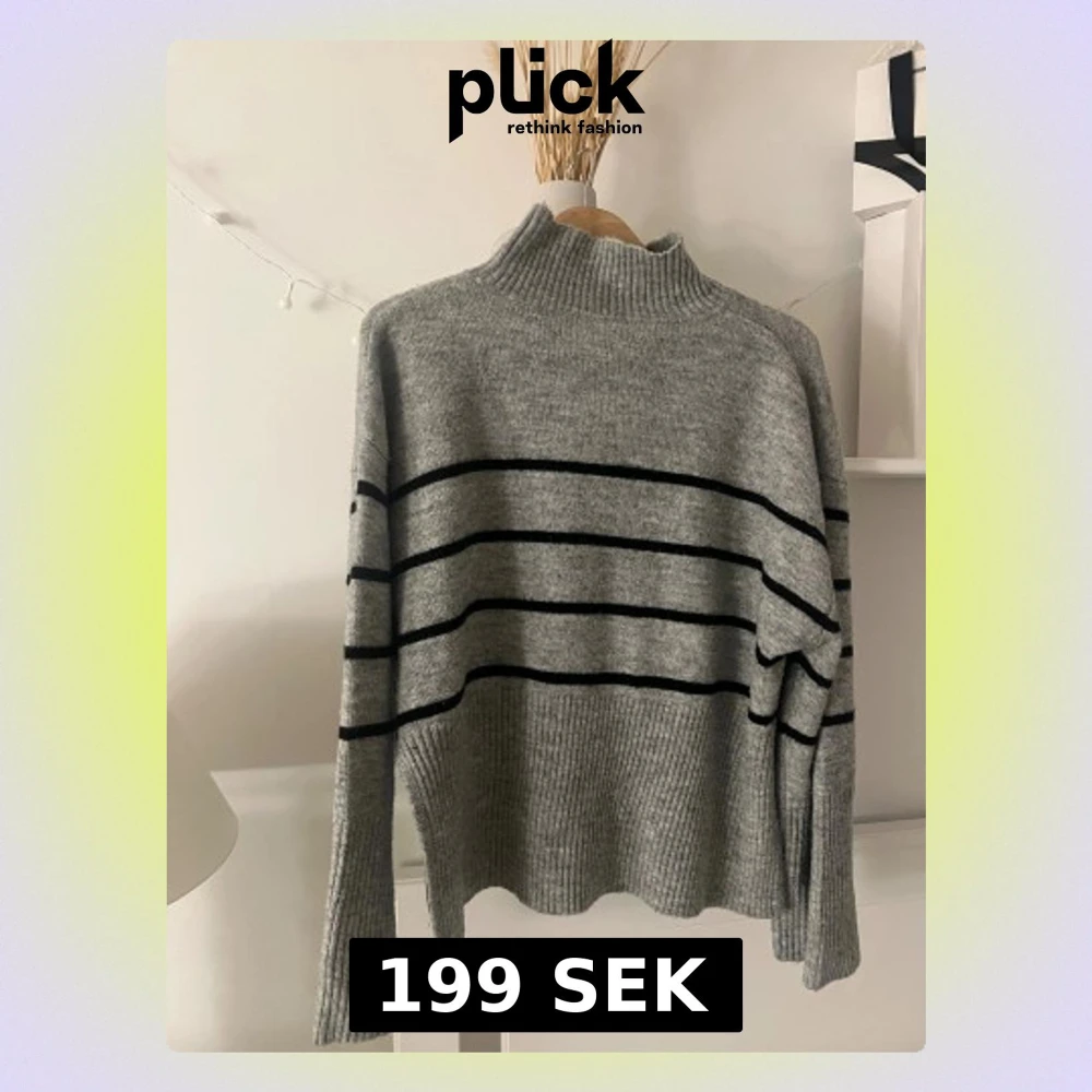 Säljer en grå stickad polotröja med svarta horisontella ränder. Tröjan har ribbad hög krage och långa ärmar med breda ribbade muddar. Perfekt för dig som gillar en chill och stilren look med lite oversized känsla.