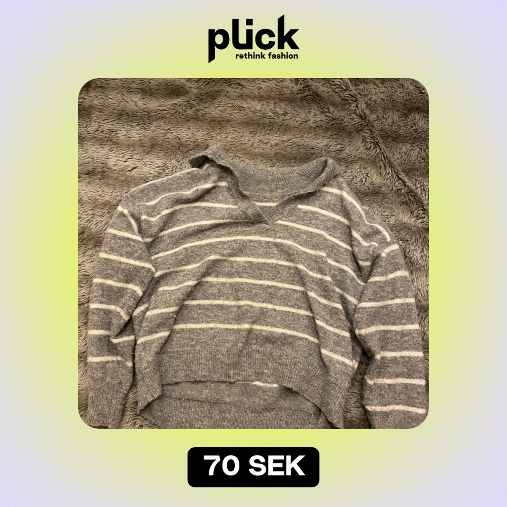 Säljer en supermysig grå stickad tröja med vita ränder. Den har en avslappnad passform och en snygg v-ringad krage. Perfekt för kyliga dagar när du vill vara både bekväm och stilren. Passar perfekt till jeans eller leggings!