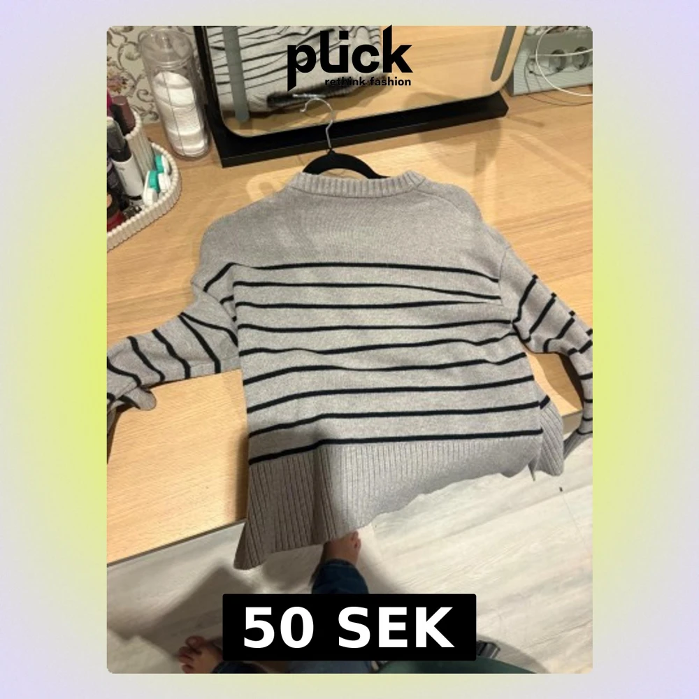 Säljer en grå stickad tröja med svarta horisontella ränder. Tröjan har ribbade muddar och nederkant samt lång ärm. Perfekt för dig som gillar en klassisk och chill stil.