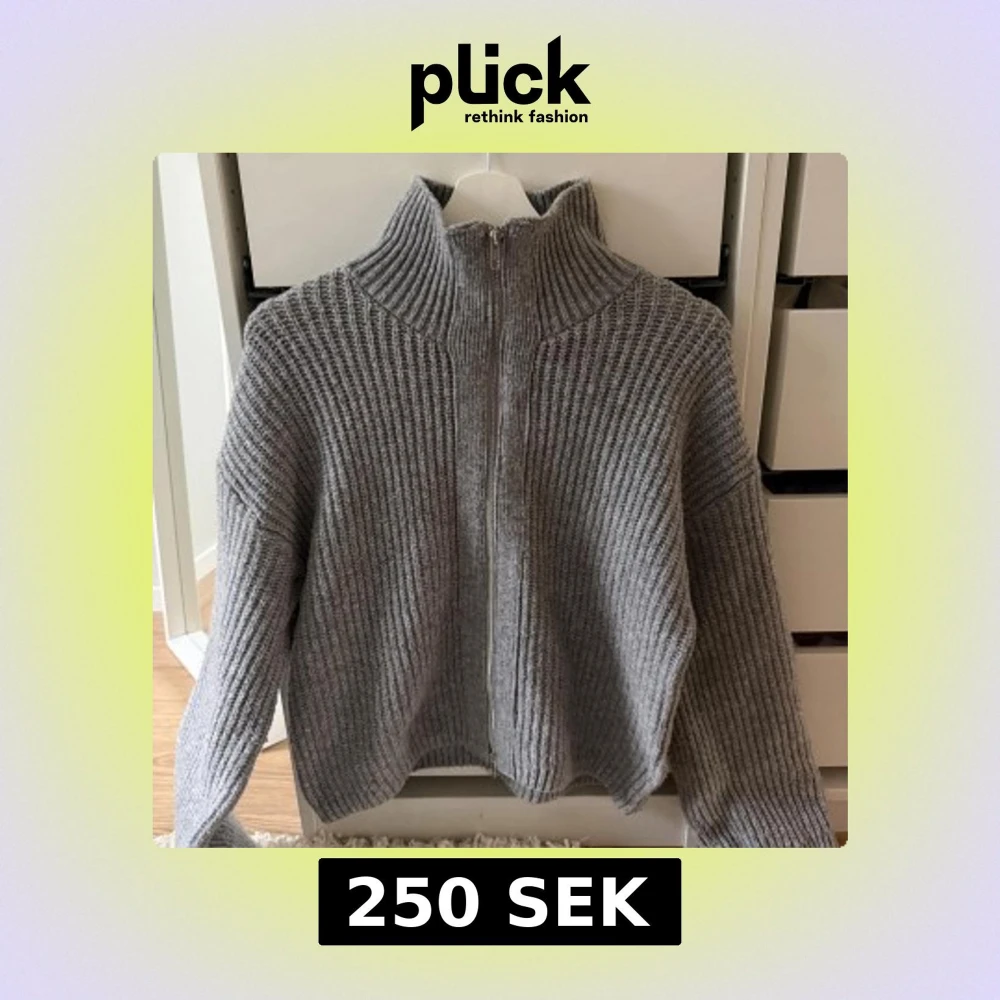 Säljer en grå ribbstickad kofta från BikBok i storlek XS. Koftan har hög krage och hel dragkedja framtill.