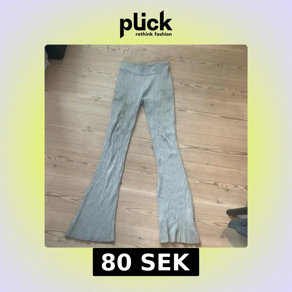 Säljer ett par grå ribbade byxor med bootcut och hög midja. De är stickade och har en mjuk, stretchig känsla som gör dem riktigt sköna att bära. Perfekta för dig som gillar en chill och trendig look med lite extra flair i benen. Byxorna är väldigt stretchiga